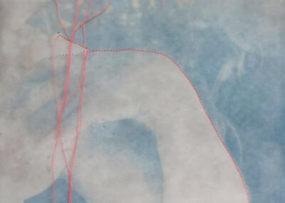 Mit den fließenden Linien der Bestickung in der Serie „Fragments“ hebt sie diese Ebene der Transzendenz hervor, während sie in der Serie „Relics“ die sich auflösenden Körperteile scheinbar wieder einzufangen versucht, versucht sie wieder fassbar zu machen.