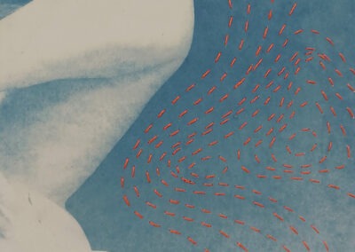 In den aktuellen Serien hier in der Ausstellung „Behind the Blue“, „Fragments“, „Relics“ und den „Floatings“, steht die Zelebrierung des eigenen Körpers wie er nun mal ist im Vordergrund. Durch die diffuse Technik der Cyanotypie verschwimmen die Körpergrenzen. Er löst sich auf, ist kaum mehr als Körper erkennbar.