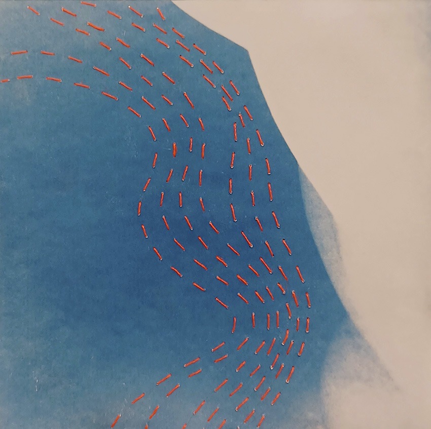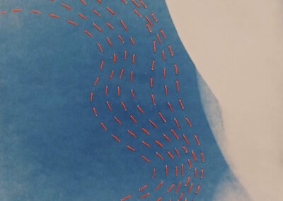 Auf einzelnen Arbeiten folgen gestickte oder genähte Linien den Körperformen, die sie wie Wasserlinien umspielen. Handstickerei oder Maschinennähte strukturieren die Bildflächen und schaffen gleichzeitig Verbindungen zueinander.