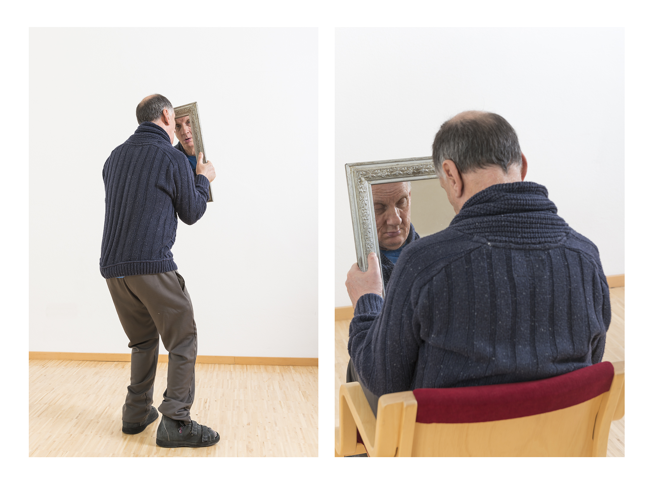 Dieses Projekt ist eine Portrait-Studie, bei der ich gemeinsam mit meinen Modellen vor und mit Spiegeln verschiedene Möglichkeiten der Selbstbetrachtung und Introspektion durchspiele, aber auch Fremdbetrachtung und Beobachtung zum Thema mache. Vor allem soll der spielerische Charakter dieser – bewusst Umwege nehmenden – Kommunikation in den Bildern in den Vorder-grund treten: ein Spiel, in dem jede/r Fotografierte selbst zu bestimmen versucht, was er/sie von sich zeigt und was ich als Fotograf von ihr/ihm zu sehen bekomme. Ein fotografisch-performatives Setting, das vermittelte visuelle Kommunikation darstellen soll: vom Beachten über das Betrachten zum (voyeuristischen) Beobachten und vielleicht sogar Bewachen.